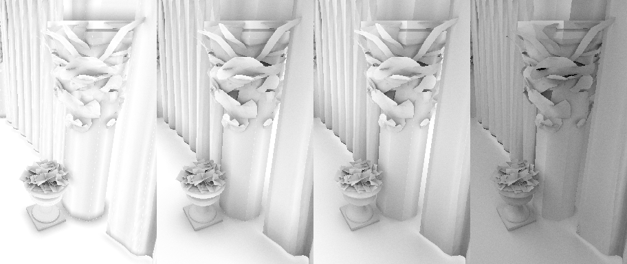 The AO gets smoother and smoother with the increased number of rays, as we get a better approximation of the hemisphere. The noise in 1 or 10 rays/pixel is very invasive.